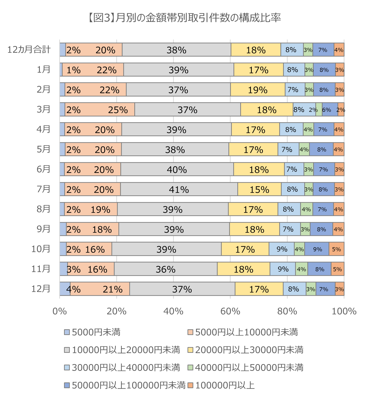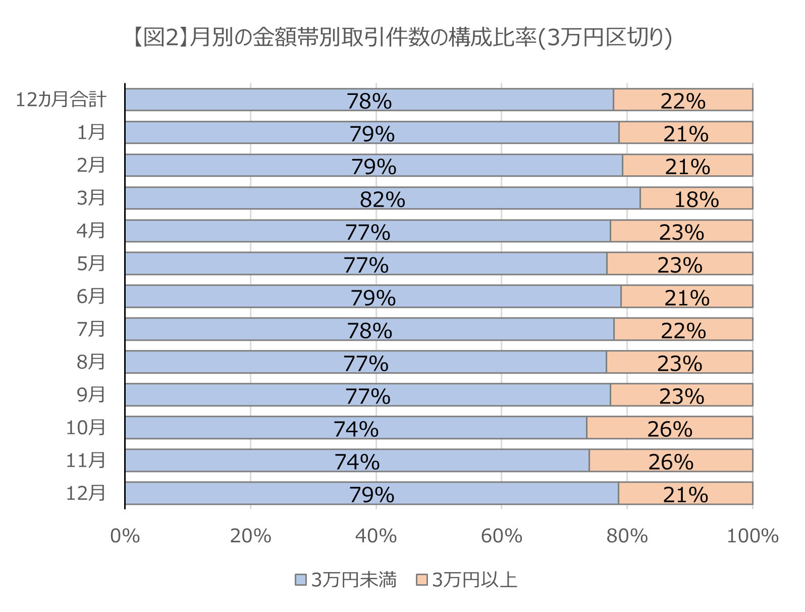 金額帯別の構成比率は3万円未満での成約が78%だった。月別では3月が82%で最高【図2】。さらに、1万円未満で成約した案件の構成比率は3月が最も高く、5万円以上での成約の構成比率が高いのは10月及び11月という結果になった【図3】。