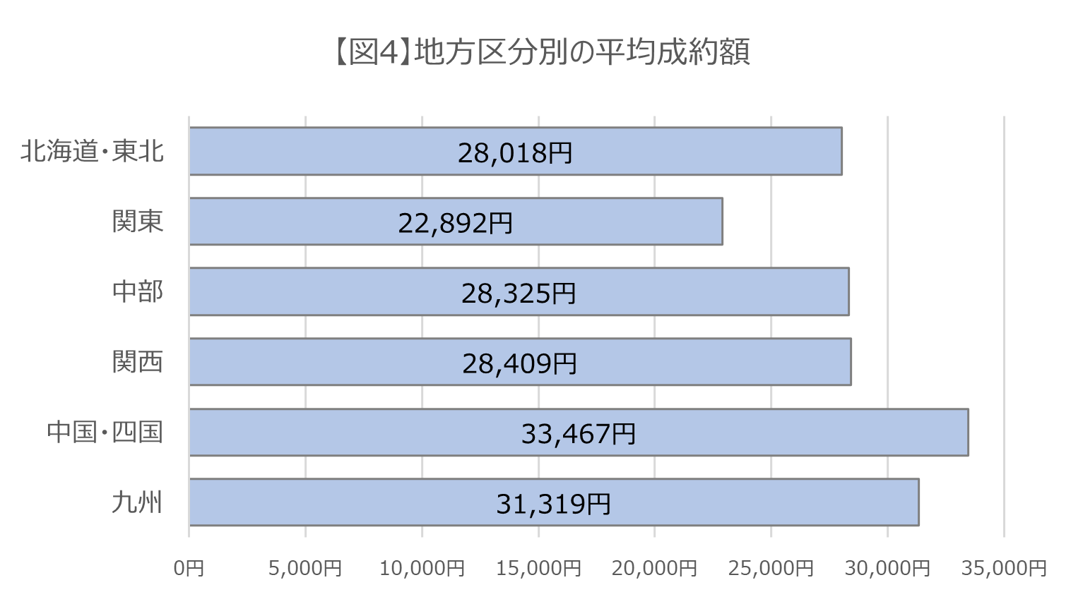 地方区分別での平均成約額は関東が22,892円で最も低い。一方で中国・四国及び九州は3万円超の結果となった【図4】。