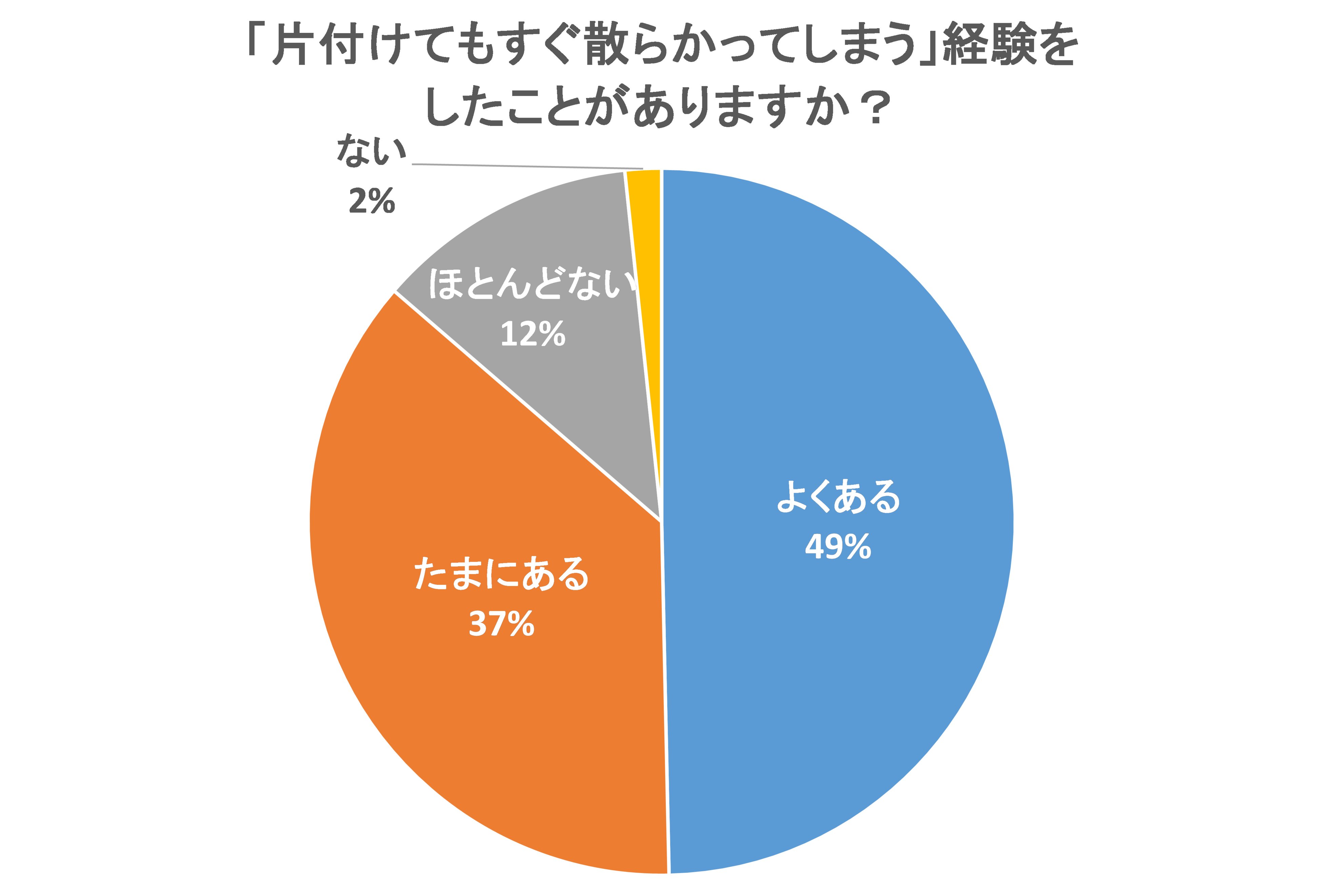 「片付けてもすぐ散らかってしまう」経験が「よくある」と回答した方が49%、「たまにある」と回答した方が37%で、全体の86%の方が経験者であることがわかりました。