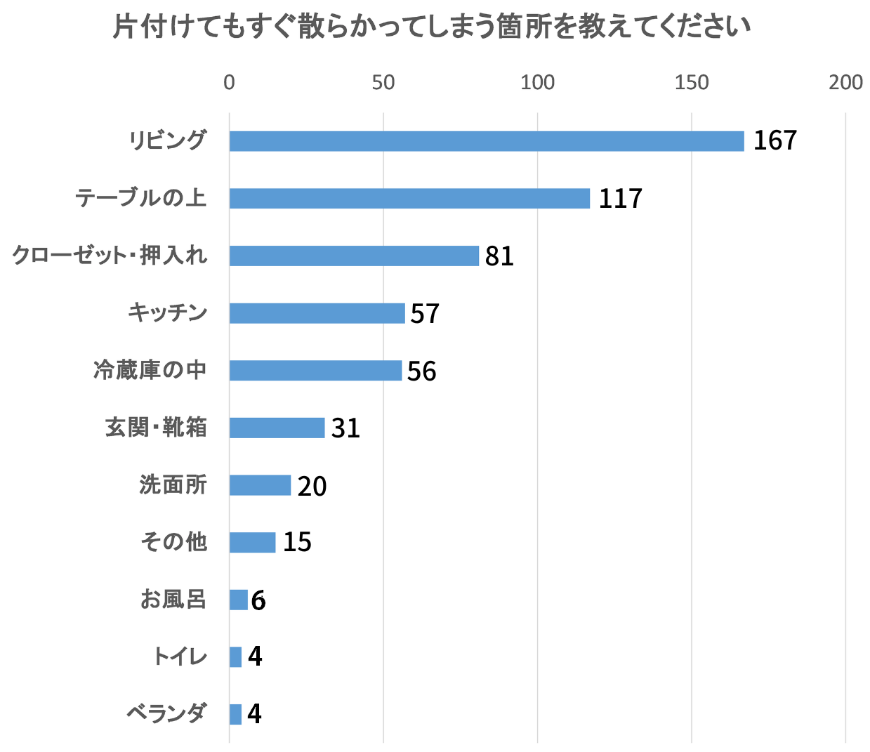 「片付けてもすぐ散らかってしまう箇所を教えてください」という質問に対しては、「リビング」が167票、「テーブルの上」が117票を集め、81票の「クローゼット・押入れ」、57票の「キッチン」、56票の「冷蔵庫」が続く結果となりました。