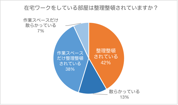 「在宅ワークをしている部屋は整理整頓されていますか?」という質問に対して、「整理整頓されている」と回答した方は、42%と半数以下の結果でした。