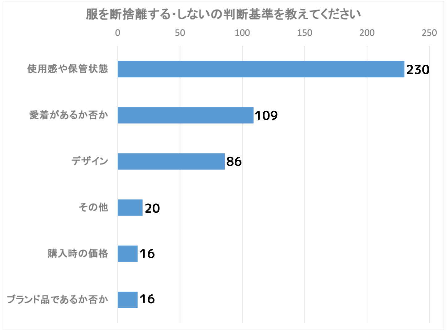 「服を断捨離する・しないの判断基準を教えてください」という質問に対しては、「使用感や保管状態」が230票、「愛着があるか否か」が109票を集め、86票の「デザイン」が続く結果となりました。