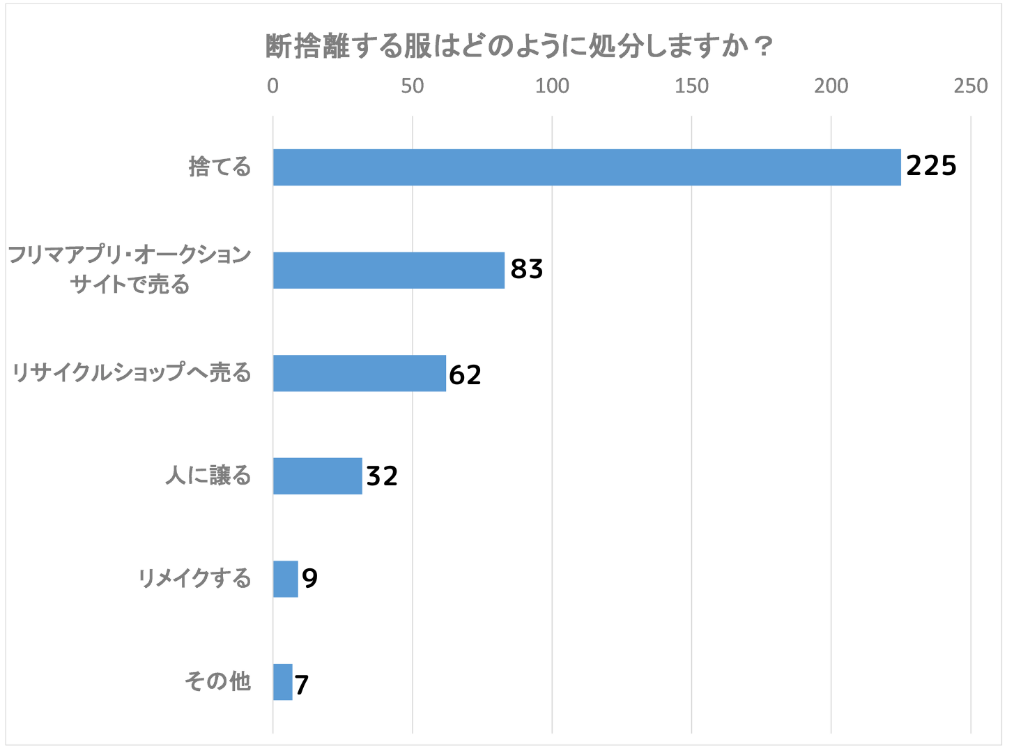 「断捨離する服はどのように処分しますか?」という質問では、「捨てる」が225票を集め、83票の「フリマアプリ・オークションサイトで売る」、62票の「リサイクルショップへ売る」、32票の「人に譲る」、9票の「リメイクする」が続く結果となりました。