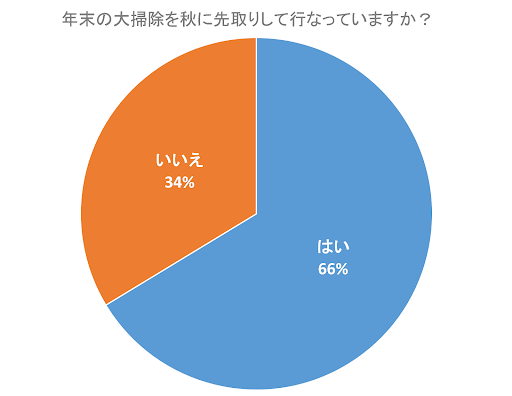 「年末の大掃除を秋に先取りして行なっていますか?」という質問では、「はい」と回答した人が66%、「いいえ」と回答した人が34%でした。