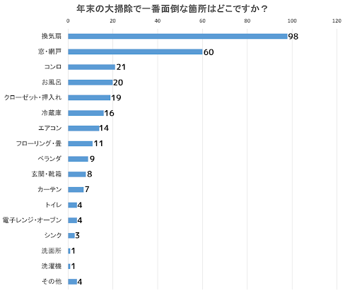 「年末の大掃除で一番面倒な箇所はどこですか?」という質問に対しては、「換気扇」が198票を集め、60票の「窓・網戸」、21票の「コンロ」、20票の「お風呂」、19票の「クローゼット・押入れ」、16票の「冷蔵庫」が続く結果となりました。