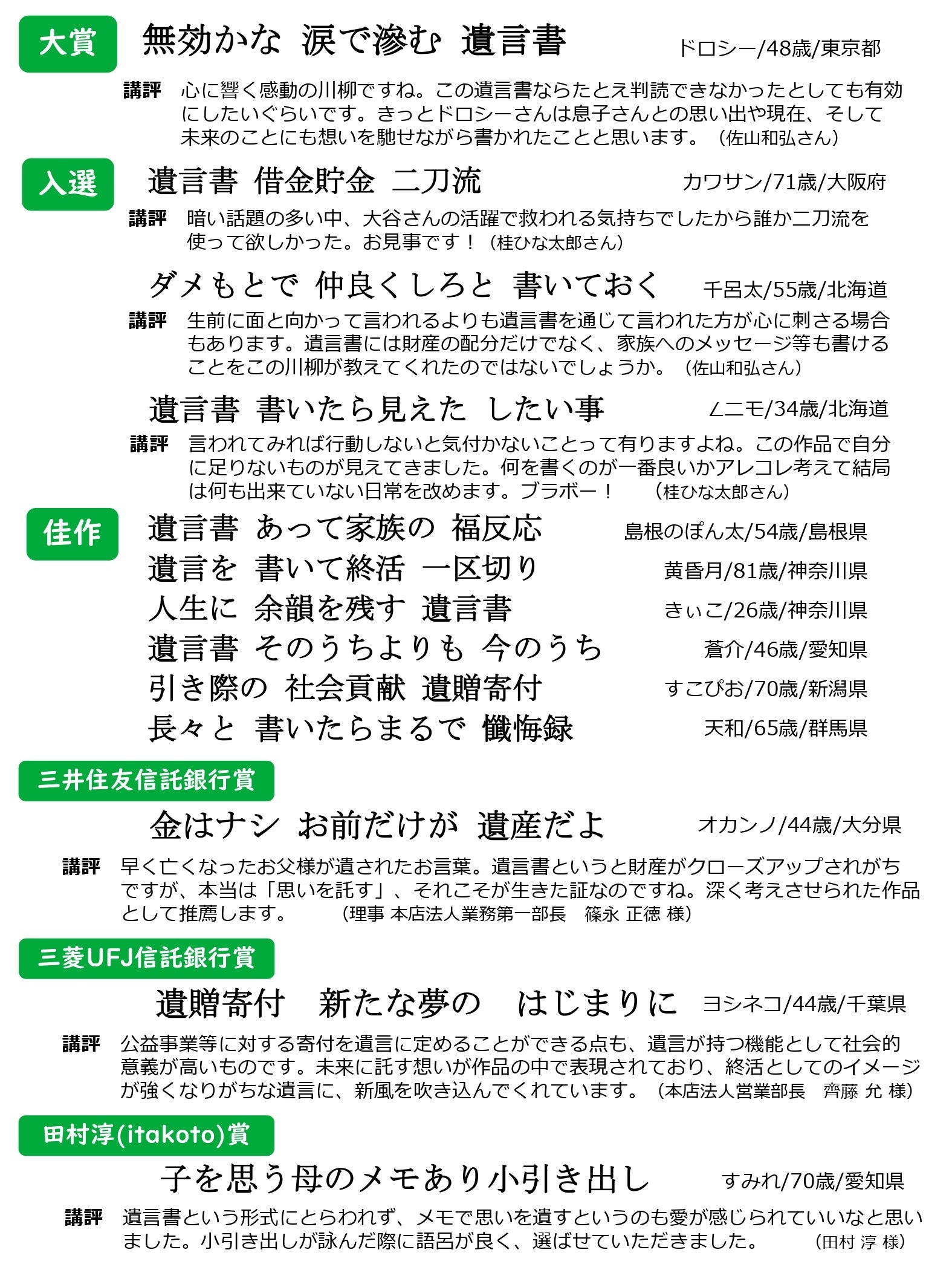7回目となる「ゆいごん川柳」は、家族や親子間の愛の言葉を表現したもの、世相を反映したもの、遺贈寄付で社会に愛を贈ることを表現したものなど、全国から過去最多の14、816作品の応募があり、大賞1、入賞3、佳作6、特別賞3の計13作品が、落語家の桂ひな太郎さんや、タレントの⽥村淳さんなどによって選考されました。