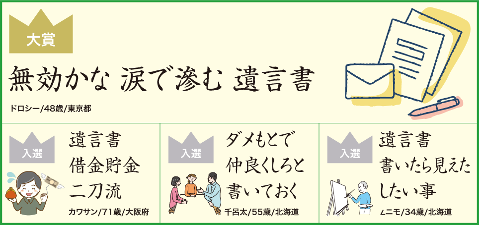 この「遺言の日」周知啓発キャンペーンとして実施した「ゆいごん川柳」の受賞作品と、60歳以上の男女2,000人に対して行った「遺言・遺贈*に関する意識・実態把握調査」の結果を発表します。