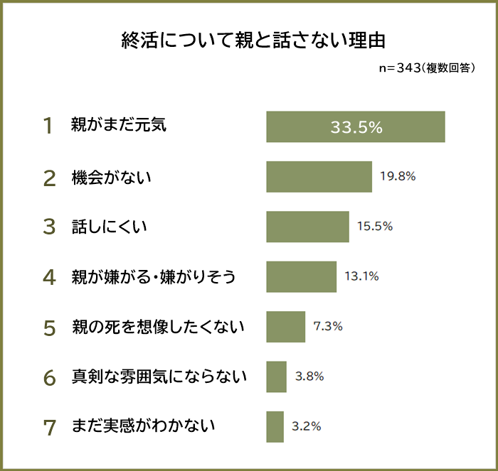 終活について親と話したことがないと回答した343人に「話さない理由」を聞いたところ、1位は「親がまだ元気(33.5%)」でした。