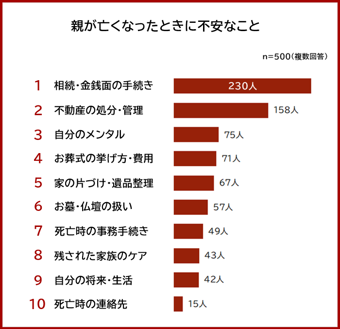 親御さんがご健在の方500人に「親が亡くなったときに不安なこと」を聞いたところ、1位は「相続・金銭面の手続き(230人)」でした。