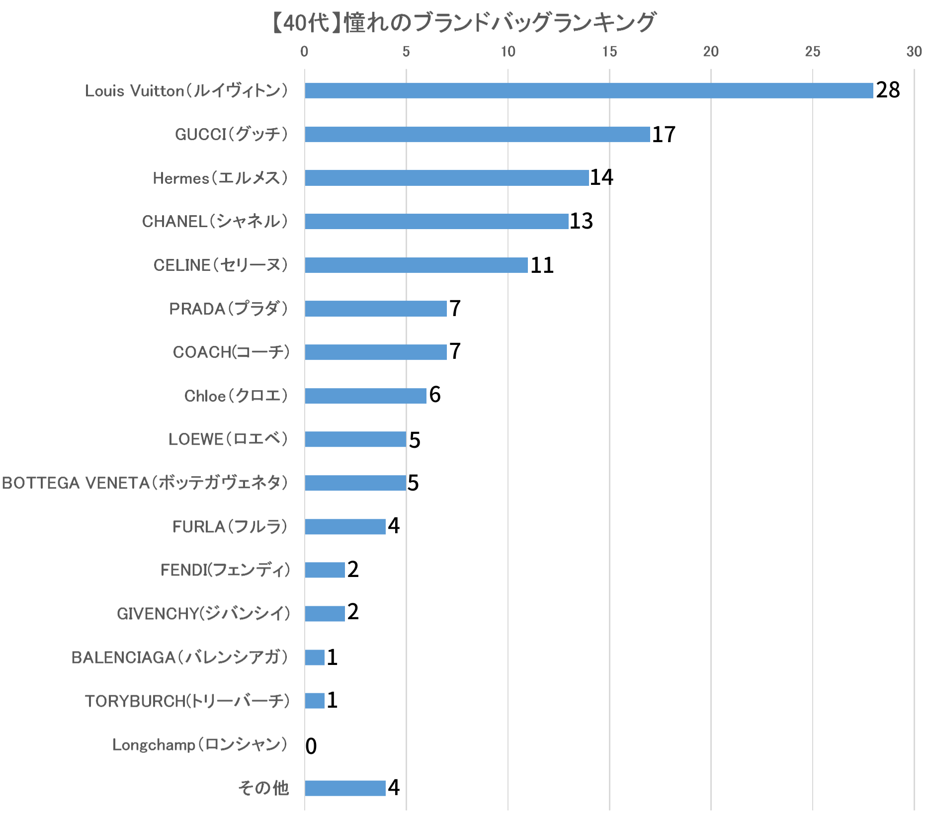 40代が憧れるブランドバッグでは「Louis Vuitton(ルイヴィトン)」が28票を集め、「GUCCI(グッチ)」17票、「Hermes(エルメス)」が14票と続く結果になりました。