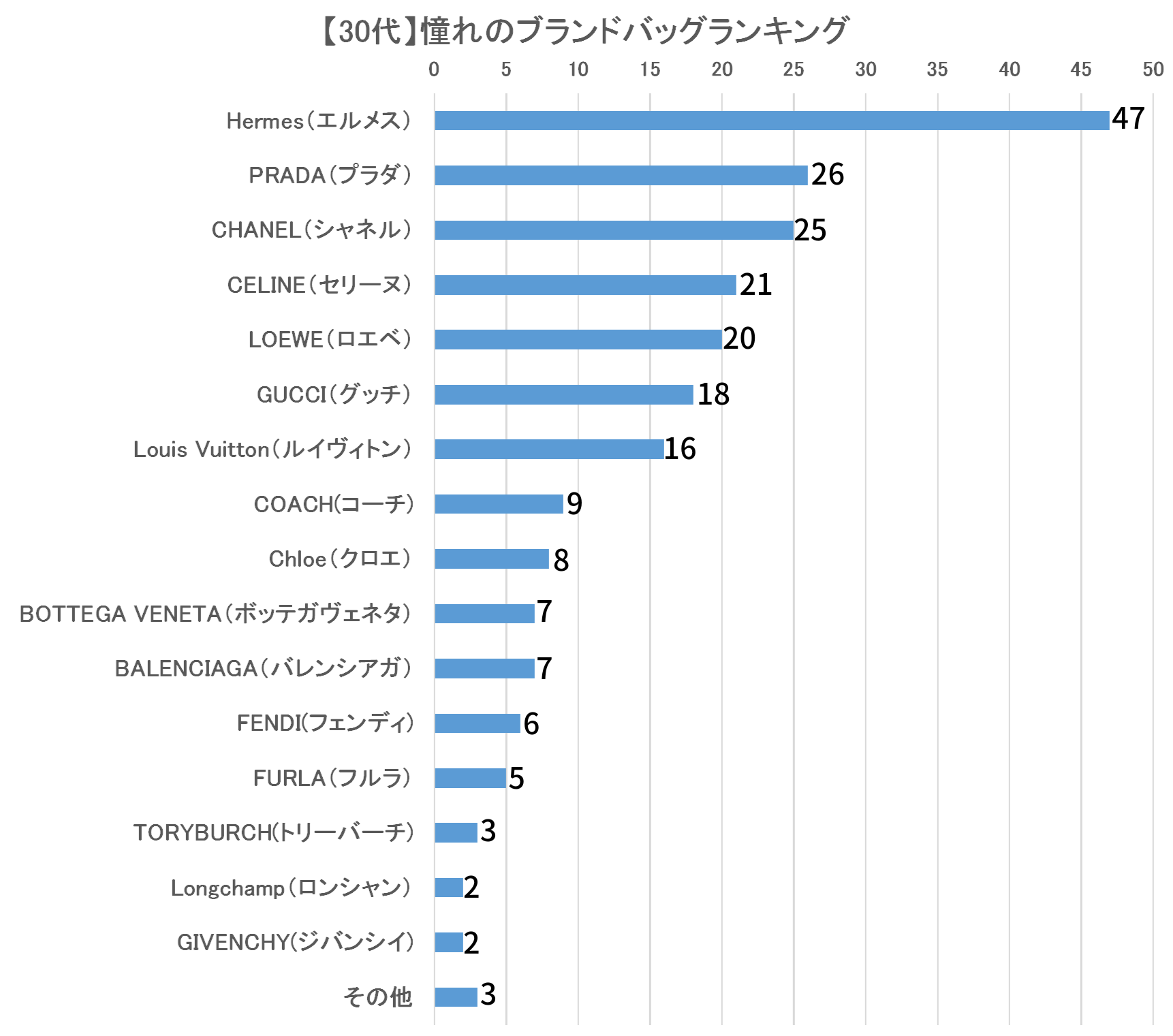 30代が憧れるブランドバッグでは「Hermes(エルメス)」が47票を集め、「PRADA(プラダ)」26票、「CHANEL(シャネル)」が25票と続く結果になりました。