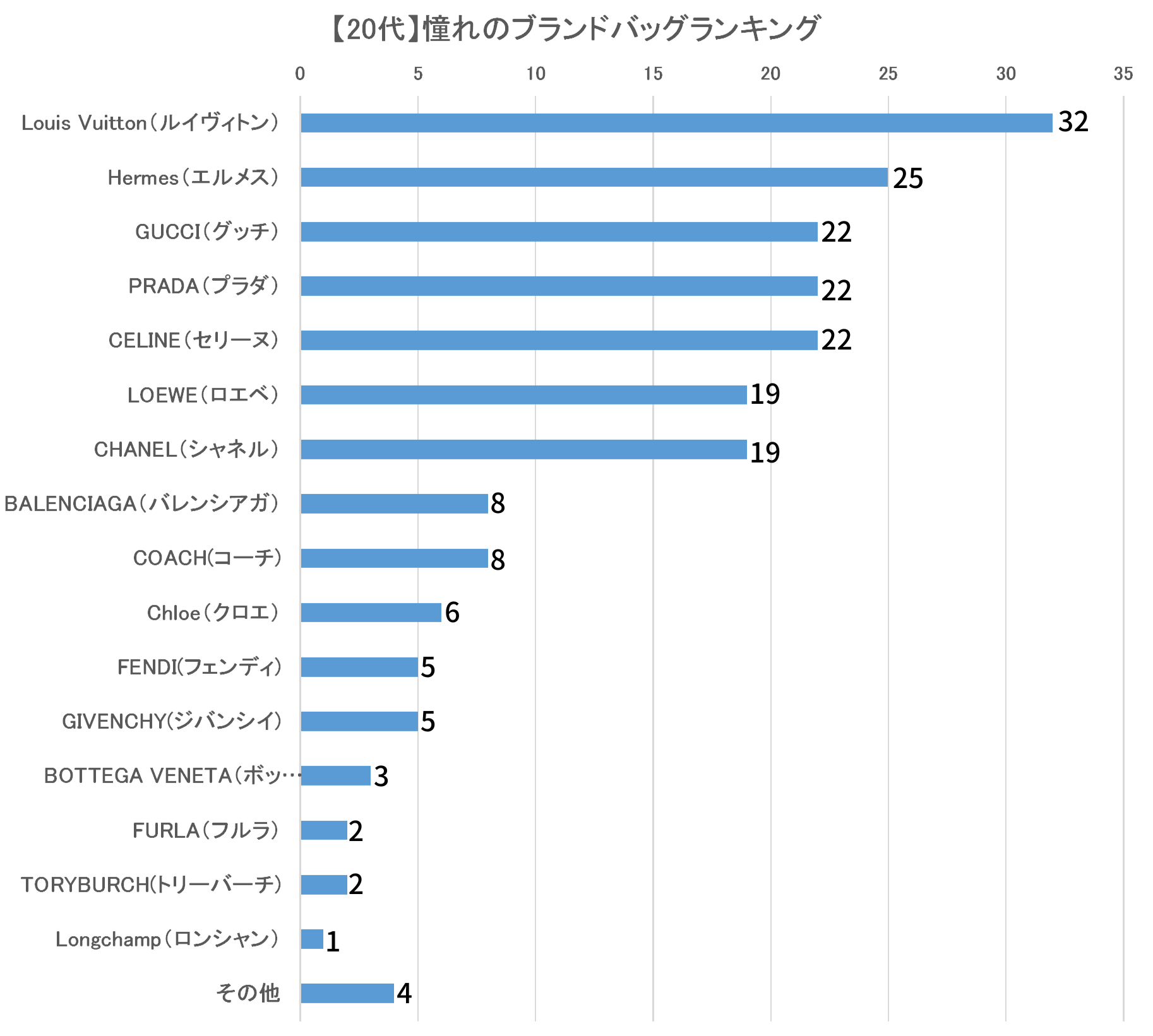 20代が憧れるブランドバッグでは「Louis Vuitton(ルイヴィトン)」が32票を集め、「Hermes(エルメス)」25票、「GUCCI(グッチ)」「PRADA(プラダ)」「CELINE(セリーヌ)」が22票と続く結果になりました。