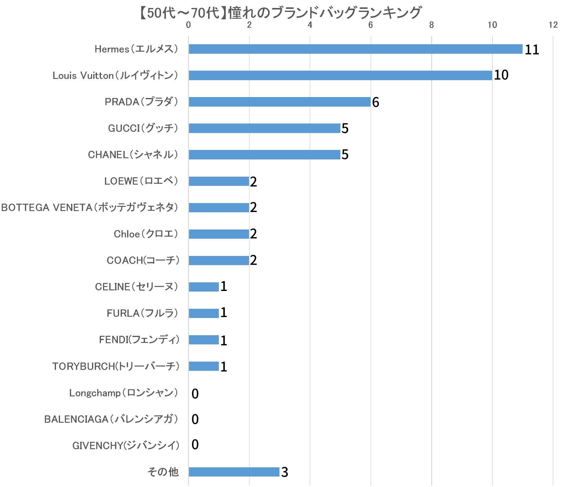 50代~70代が憧れるブランドバッグでは「Hermes(エルメス)」が11票を集め、「Louis Vuitton(ルイヴィトン)」10票、「PRADA(プラダ)」が6票と続く結果になりました。