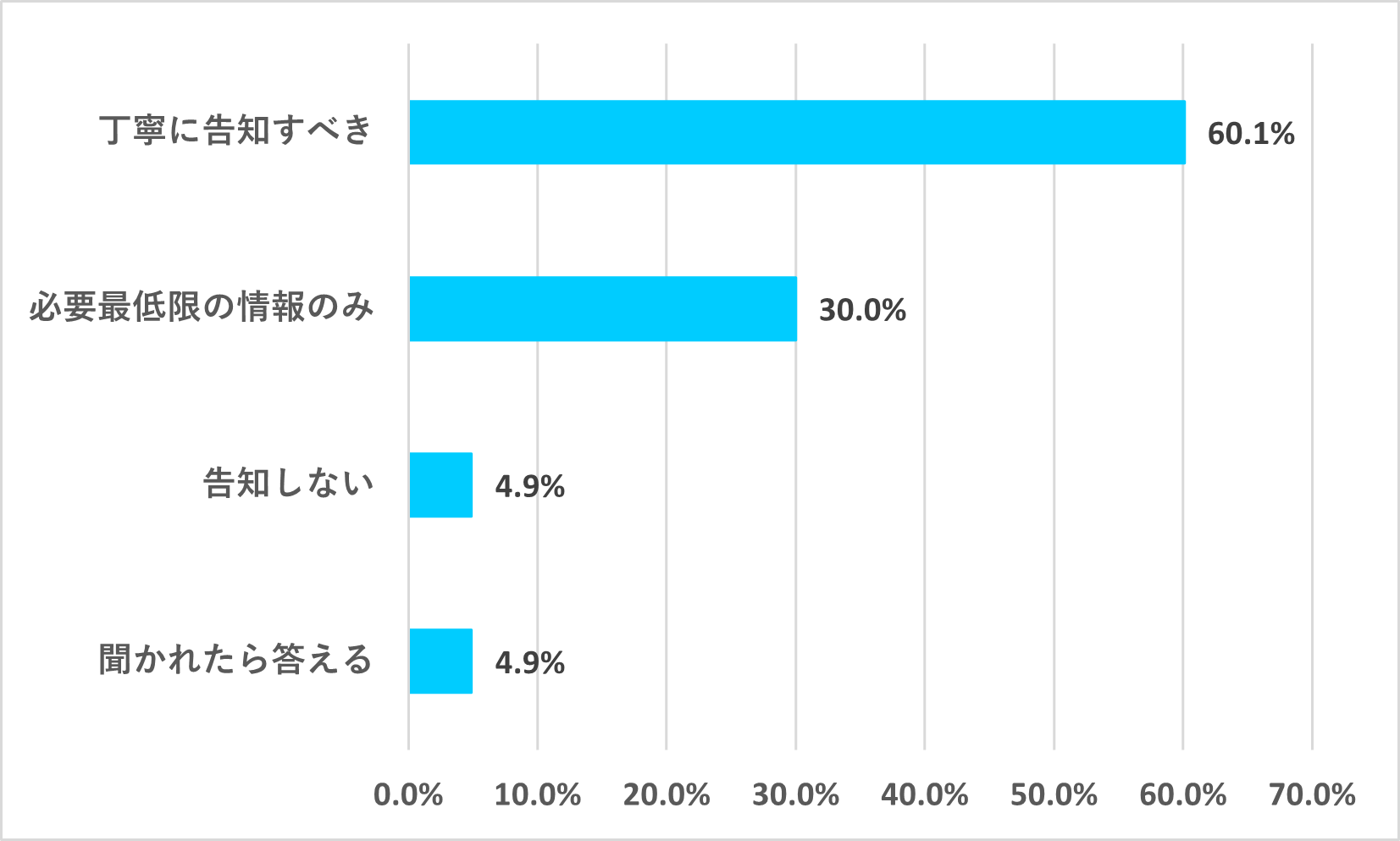 60.1%が「丁寧に告知すべき」、30.0%が「必要最低限の情報のみ」と回答している一方で、4.9%が「告知しない」、4.9%が「聞かれたら答える」ことが望ましいと回答しています。
