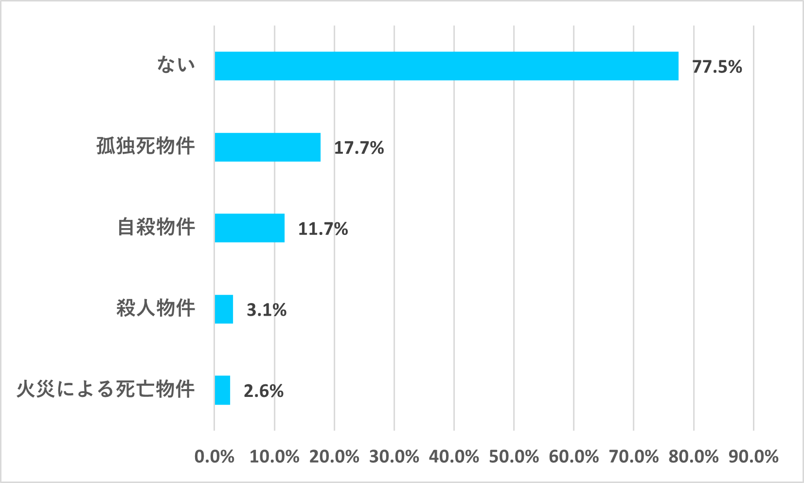77.5%が「ない」と回答しダントツでトップに。事故物件を取り扱ったことがあると答えた人の内訳として17.7%が「孤独死物件」、11.7%が「自殺物件」、3.1%が「殺人物件」、2.6%が「火災による死亡物件」と回答しています。