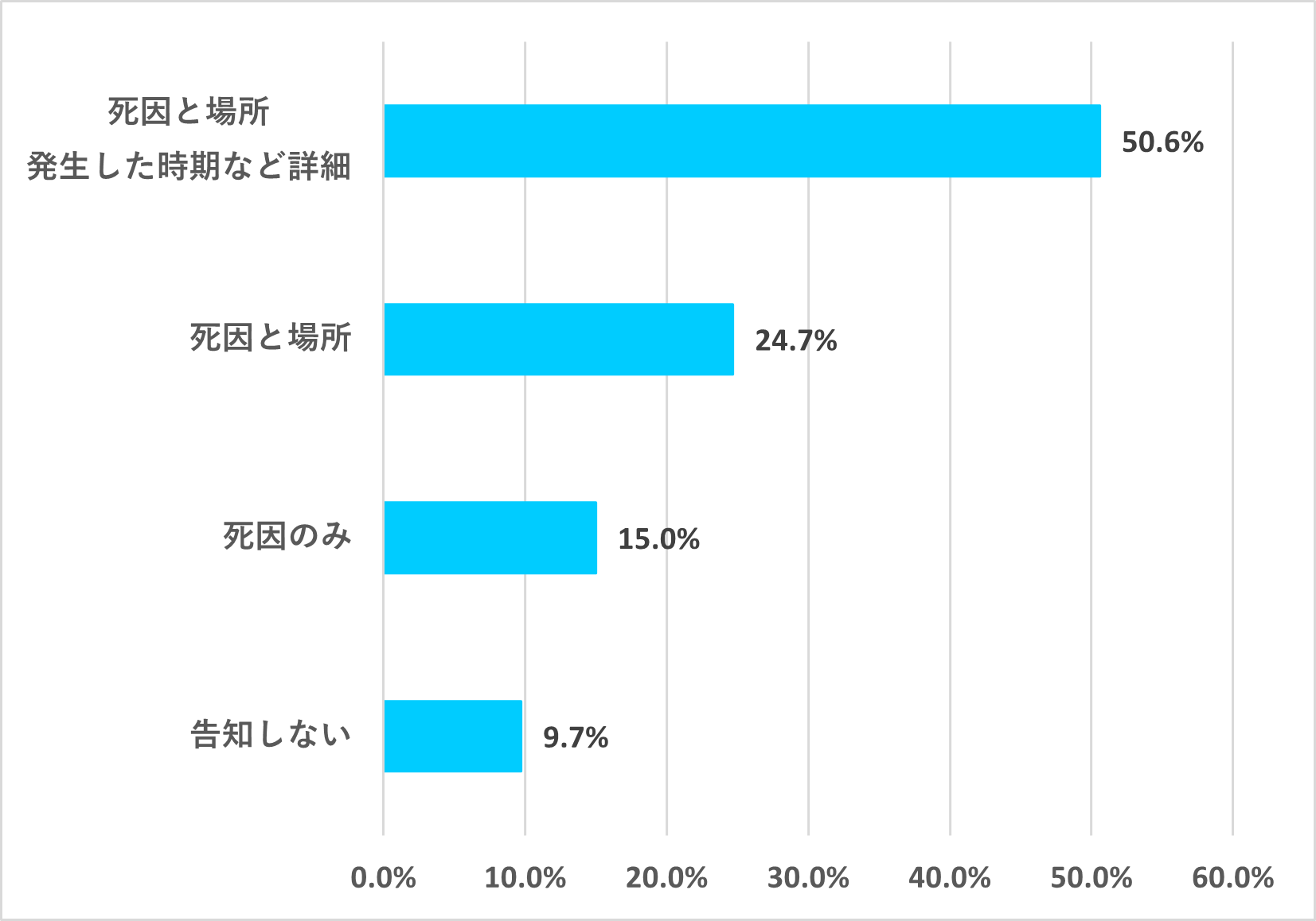 50.6%が「死因と場所、発生した時期など詳細」までしっかりと伝えると回答しています。なんと、9.7%が「告知しない」と回答しています。