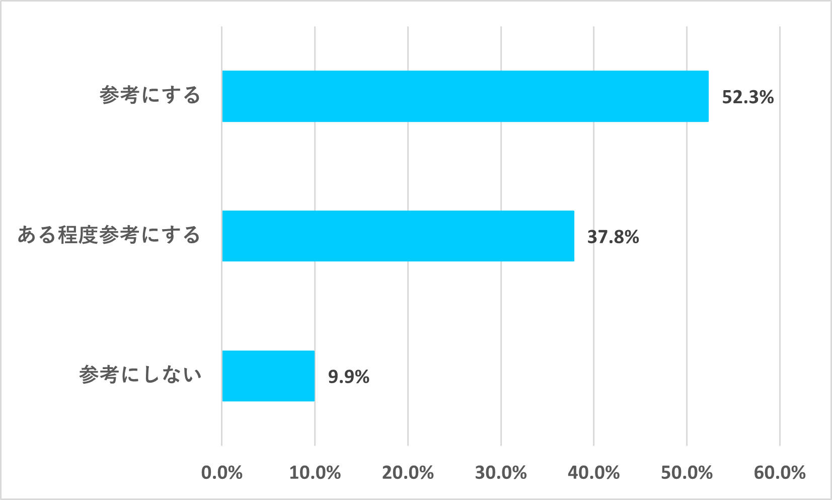 52.3%が「参考にする」、37.8%が「ある程度参考にする」と回答しており、9.9%は「参考にしない」と回答しています。