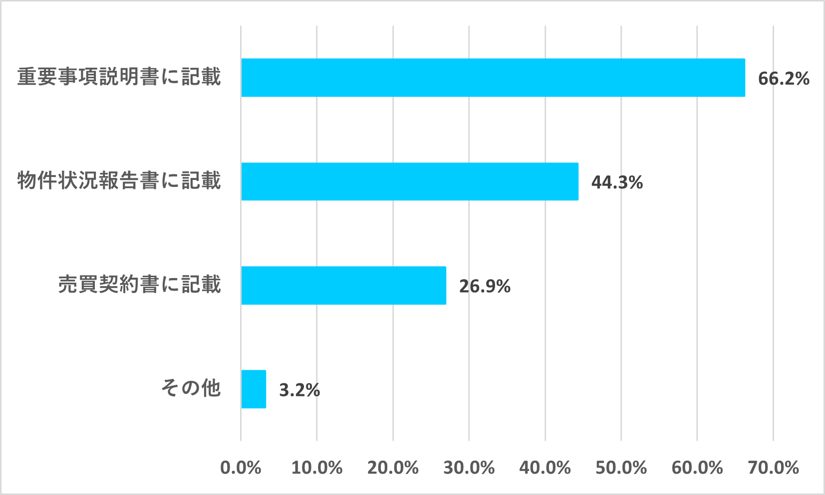 66.2%が「重要事項説明書に記載」、44.3%が「物件状況報告書に記載」、26.9%が「売買契約書に記載」と回答しており、全体として契約書類にしっかりと告知内容を記載していることが分かりました。