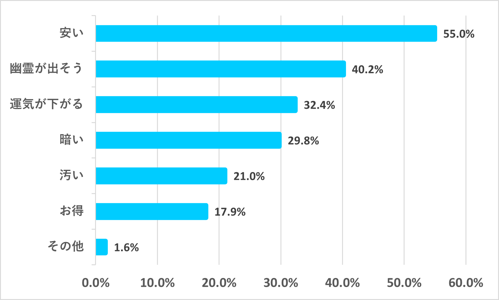55.0%で「安い」がトップに。40.2%が「幽霊が出そう」、32.4%が「運気が下がる」、29.8%が「暗い」、21.0%が「汚い」といったネガティブイメージが多くありました。