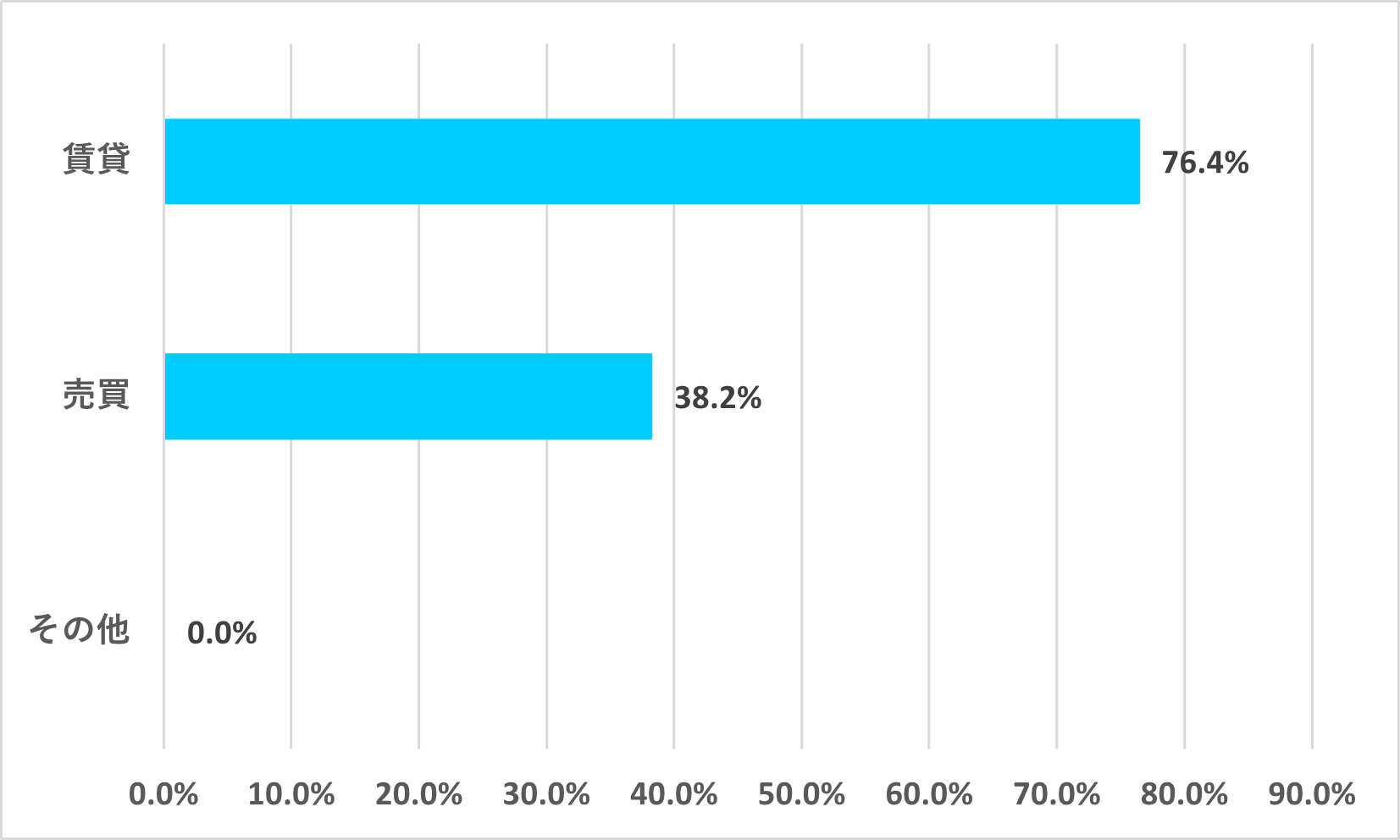 76.4%が「賃貸」、38.2%が「売買」と回答し、賃貸の方が事故物件の取引が多いようです。