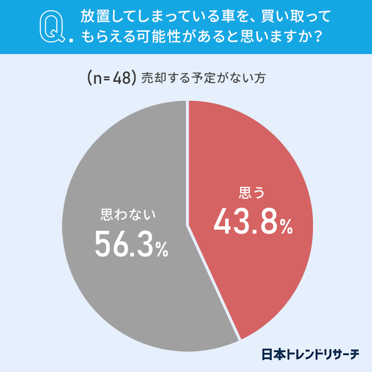 56.3%と半数以上の方が、放置してしまっている車は「買い取ってもらえないだろう」と考えていることが分かりました。