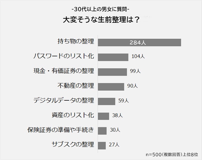 大変そうに感じる生前整理の圧倒的1位は「持ち物の整理(284人)」でした。2位は「パスワードのリスト化(104人)」、3位は「現金・有価証券の整理(99人)」、4位は「不動産の整理(90人)」でした。