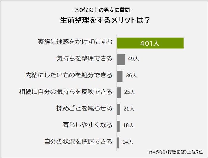 「生前整理をすることにどのようなメリットを感じるか」を聞いたところ、ダントツは「家族に迷惑をかけずにすむ(401人)」で、全体の8割以上を占めました。自分の都合というよりも、家族のためを思って生前整理する人が多いとわかります。