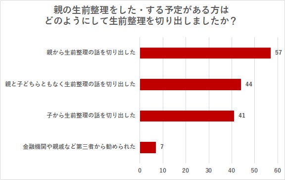 「親の生前整理をした・する予定がある方はどのようにして生前整理を切り出しましたか?」という設問に対して、「親から生前整理の話を切り出した」という方が多い結果となりました。次いで、「親と子どちらともなく生前整理の話を切り出した」「子から生前整理の話を切り出した」となっています。