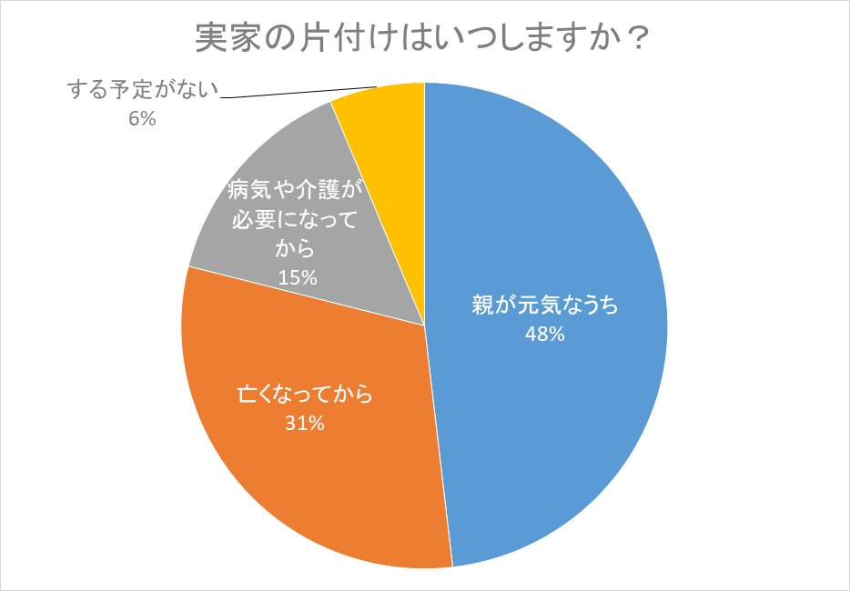 「実家の片付けはいつしますか?」という質問に対して、全体の48%の方が「親が元気なうち」、31%の方が「亡くなってから」と回答し、「病気や介護が必要になってから」15%、「する予定がない」6%と続く結果になりました。