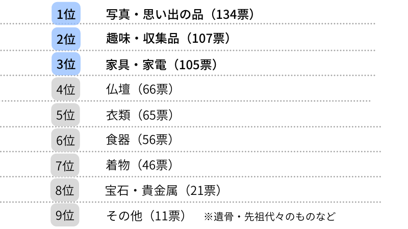 「実家の片付けで処分に困るものを教えてください」という問いに対しては、「写真・思い出の品」が134票、「趣味・収集品」が107票、「家具・家電」が105票を集め、「仏壇」「衣類」が続く結果となりました。
