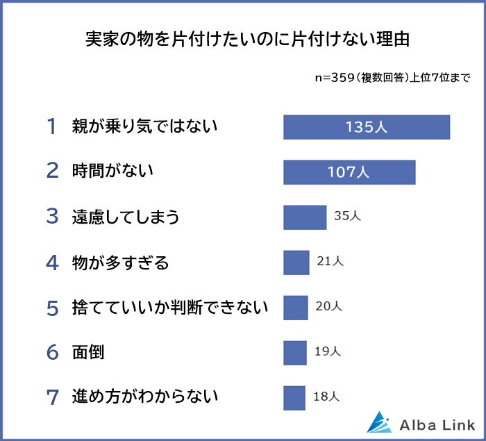 1位になったのは「親が乗り気ではない(135人)」です。次ぐ2位は「時間がない(107人)」、3位「遠慮してしまう(35人)」、4位「物が多すぎる(21人)」と続きます。