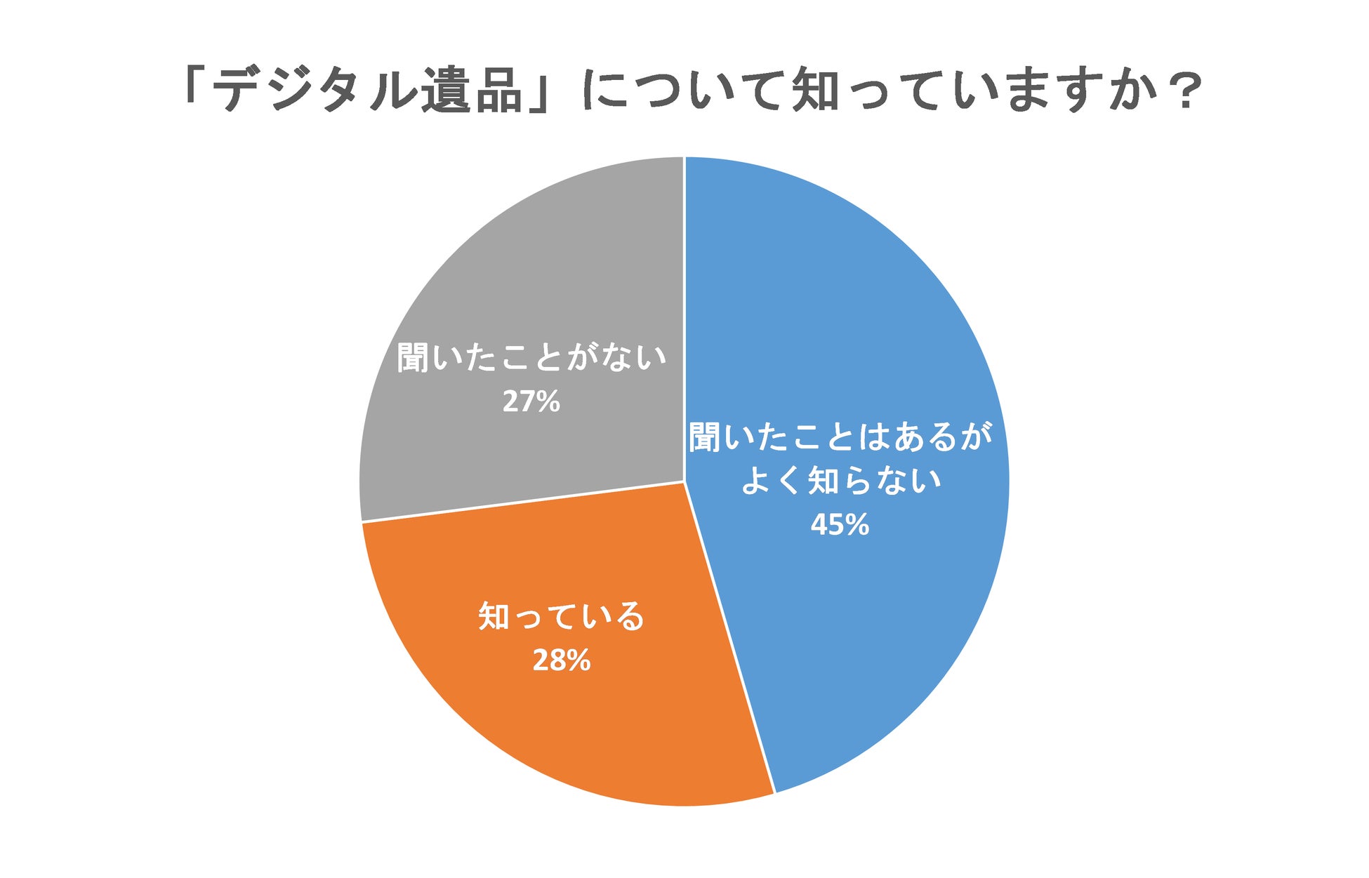 「『デジタル遺品』について知っていますか?」という質問では、45%が「聞いたことはあるがよく知らない」と回答し、「知っている」が28%、「聞いたことがない」が27%と続く結果になりました。
