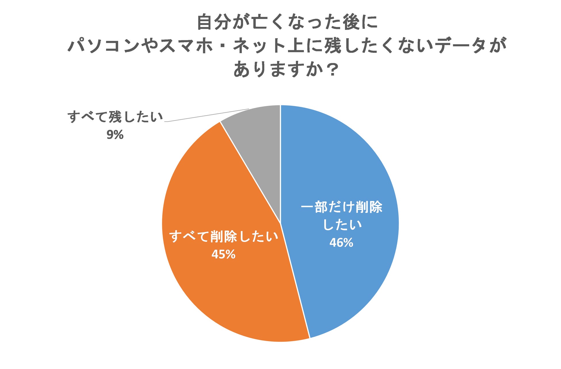 「自分が亡くなった後にパソコンやスマホ・ネット上に残したくないデータがありますか?」という質問では、46%の「一部だけ削除したい」と45%の「すべて削除したい」が拮抗する結果になり、「すべて残したい」は9%にとどまっています。