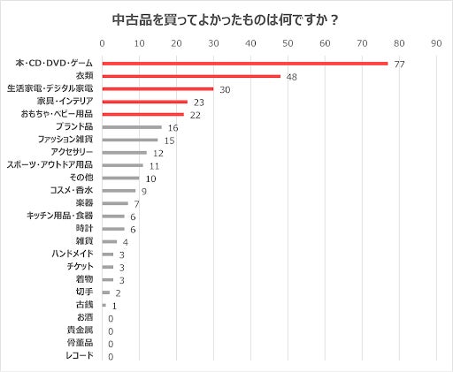 「中古品を買ってよかったものは何ですか?」とお聞きしたところ、1位が「本・CD・DVD・ゲーム」で77票を集め、2位が「衣類」で48票、3位が「生活家電・デジタル家電」で30票という結果でした。