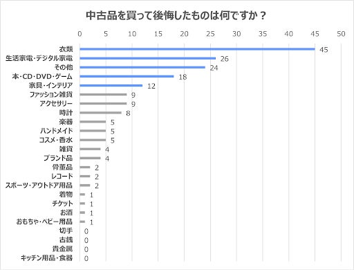 「中古品を買って後悔したものは何ですか?」という質問では、1位が「衣類」で45票、2位が「生活家電・デジタル家電」で26票、3位が「その他」で24票を集めています。