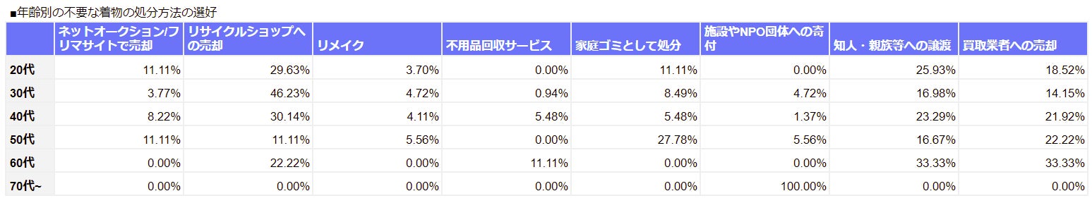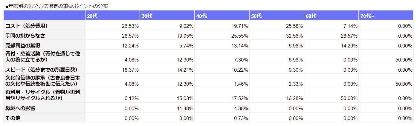 このように、年齢層ごとに着物の処分に対する意識やアプローチが異なっていることが確認できます。若い世代は効率的な処分を求め、高齢の世代は文化的価値の継承や物の再評価を重視しています。