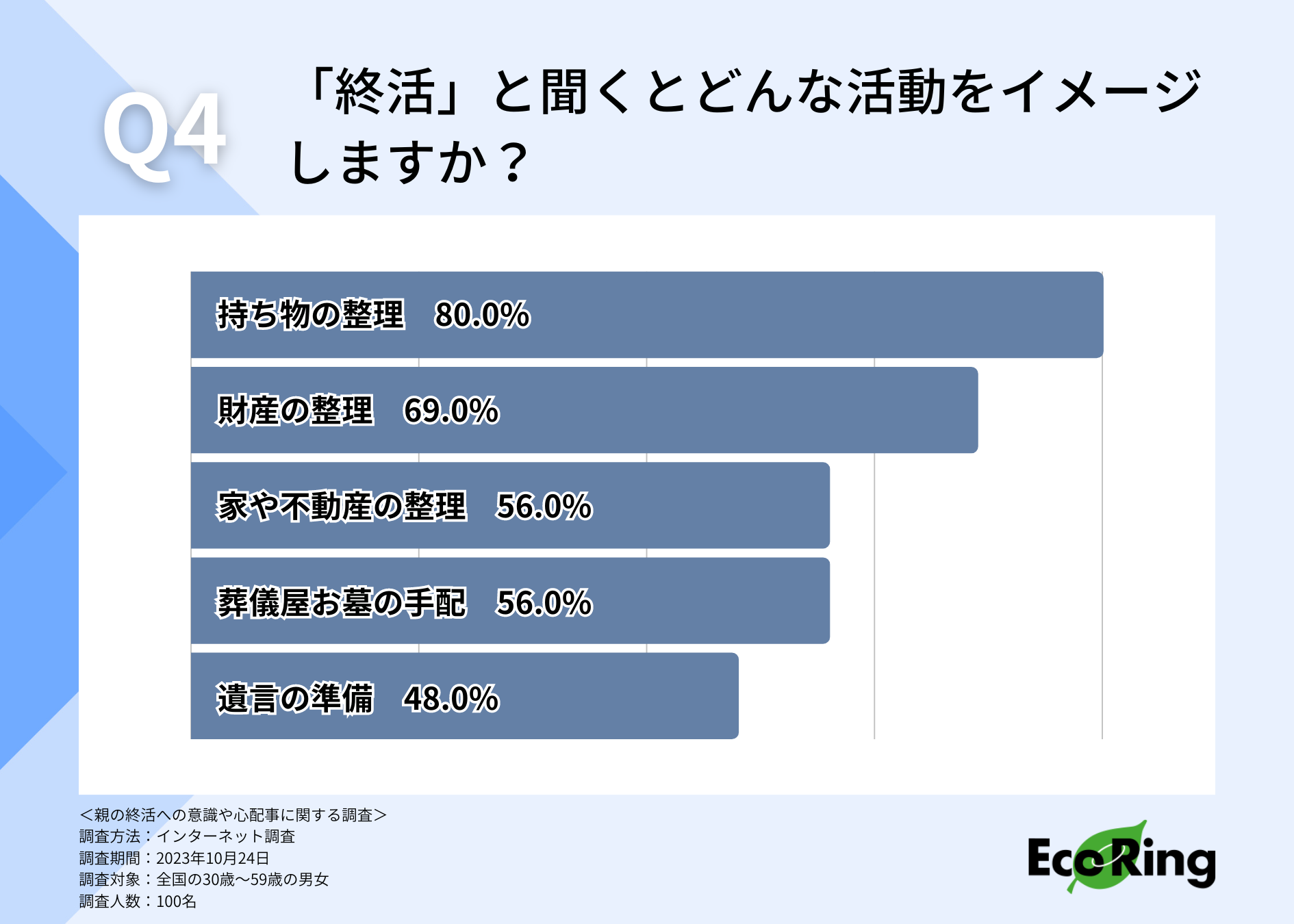 そこで、「終活」と聞くとどのような活動をイメージするのか伺ったところ、「持ち物の整理(80.0%)」と回答した方が最も多い結果となりました。