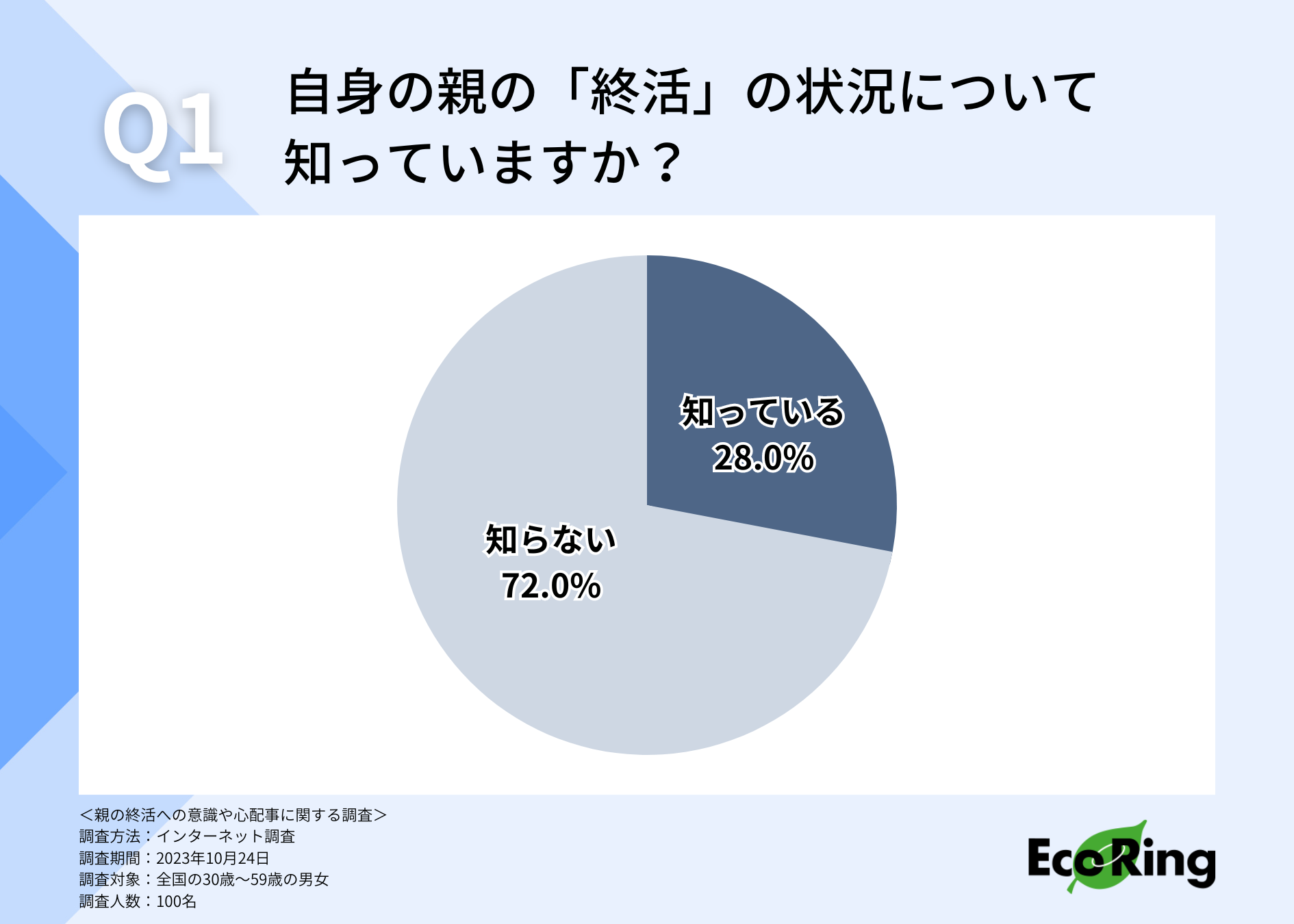 はじめに、自身の親の「終活」状況について知っているか伺ってみたところ、「知らない(72.0%)」「知っている(28.0%)」という回答が集まりました。