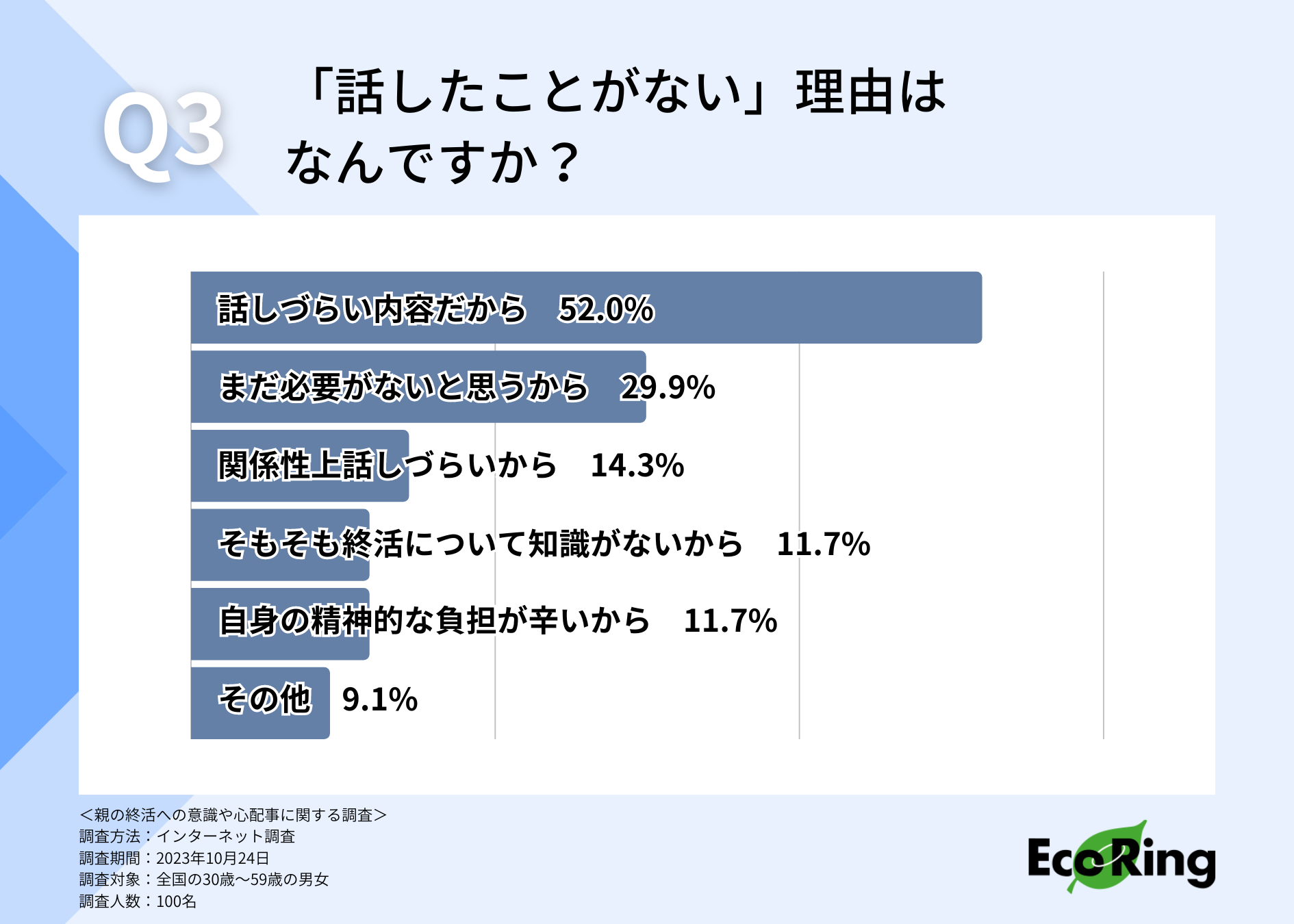次に、終活について「話したことがない」と回答した理由について伺ったところ、「話しづらい話題だから(52.0%)」と回答した方が最も多い結果となりました。