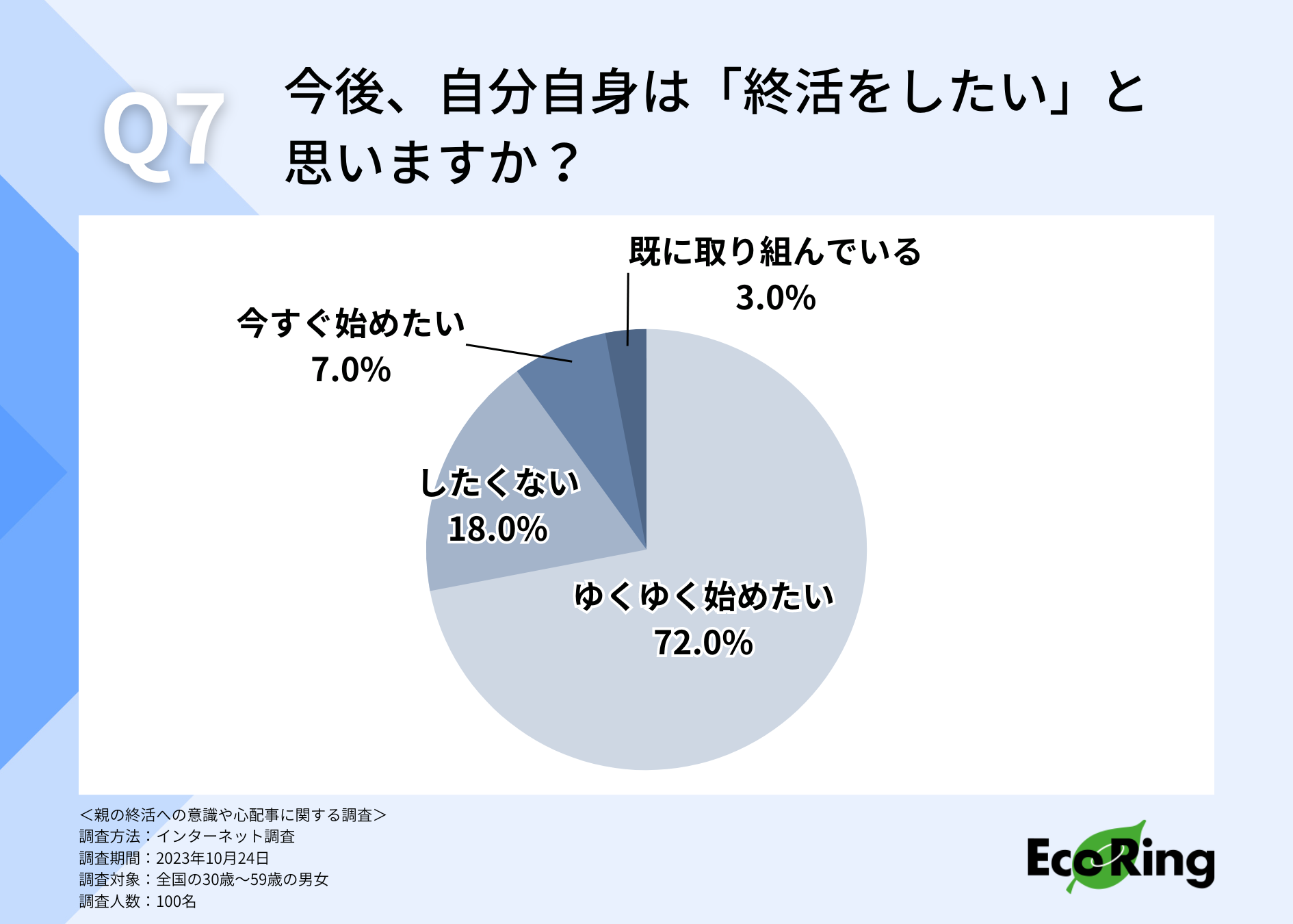 最後に、自分自身は「終活をしたい」と思うか伺ったところ、7割以上の方が「ゆくゆく始めたい(72.0%)」と回答しました。