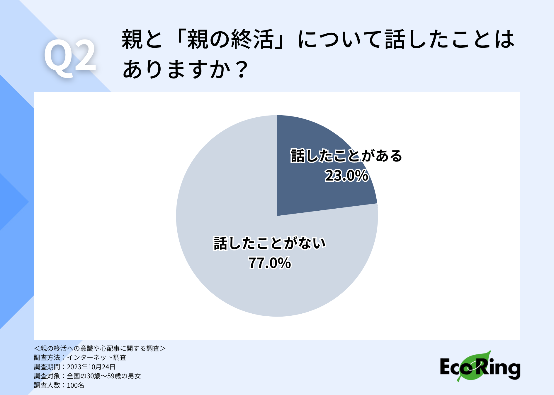そこで、「親の終活」について親と話したことがあるのか伺ったところ、「話したことがない(77.0%)」「話したことがある(23.0%)」という回答が集まりました。