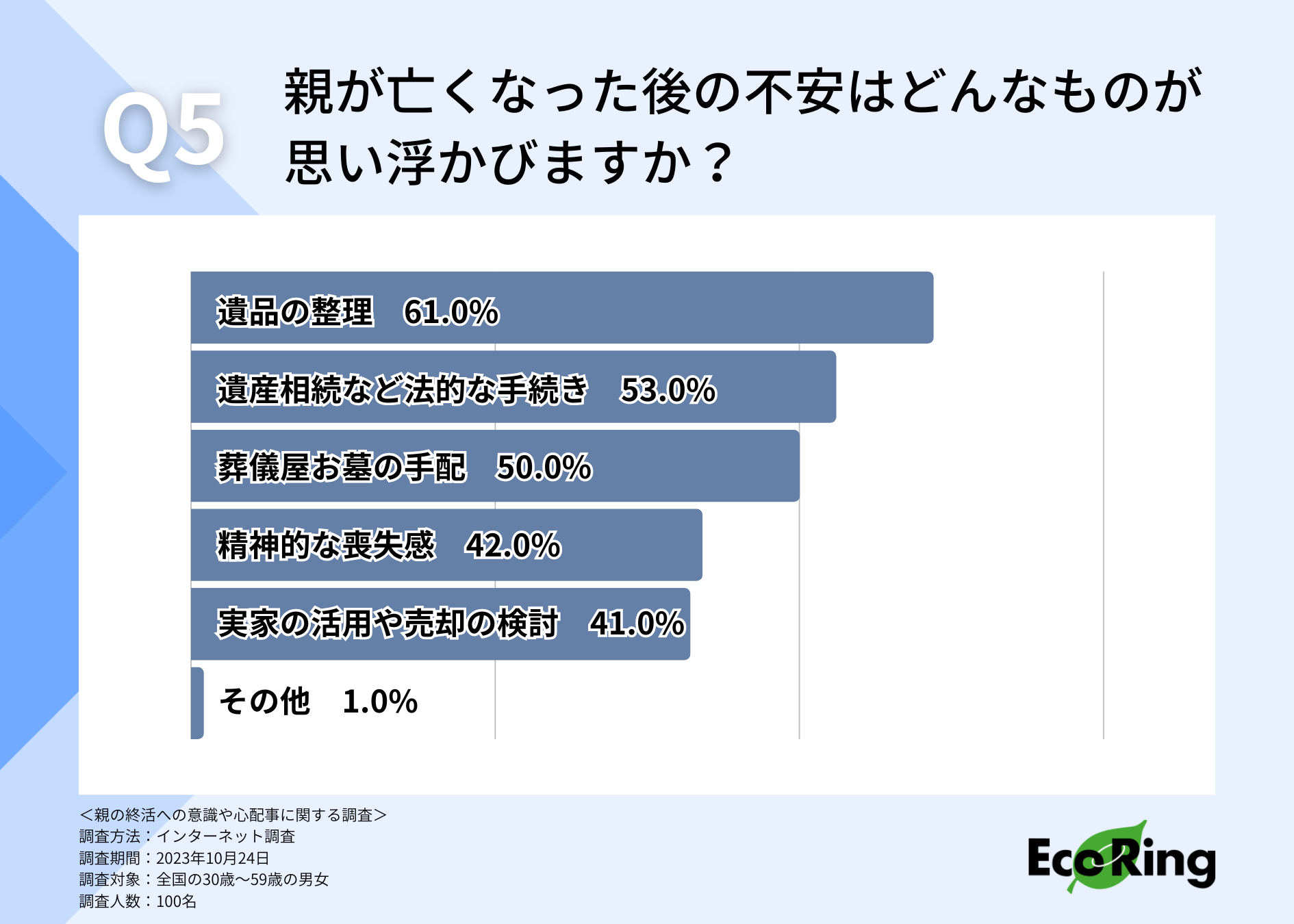 終活に対するイメージが明らかになりましたが、実際に親が亡くなってから不安に感じることを伺ったところ、「遺品の整理(61.0%)」という回答が最も多く集まりました。