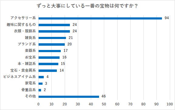 300名の男女を対象に「ずっと大事にしている一番の宝物は何ですか?」という質問をしたところ、一番多くの票数を集めたのはアクセサリー系でした。
