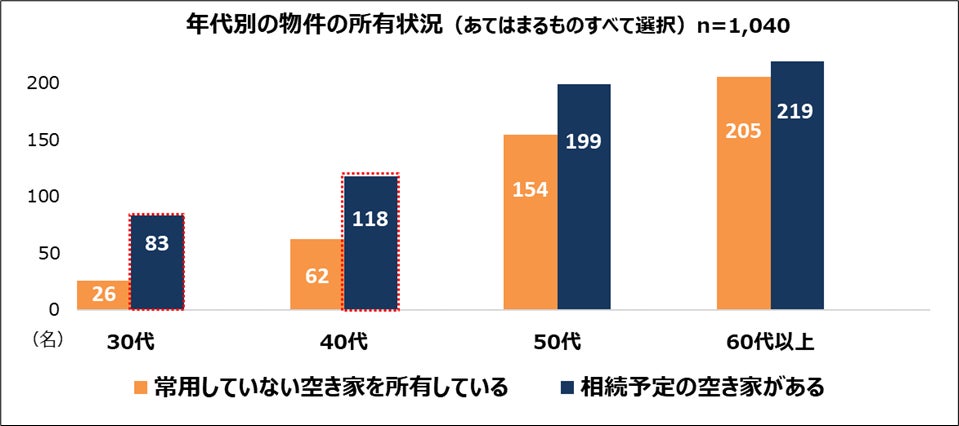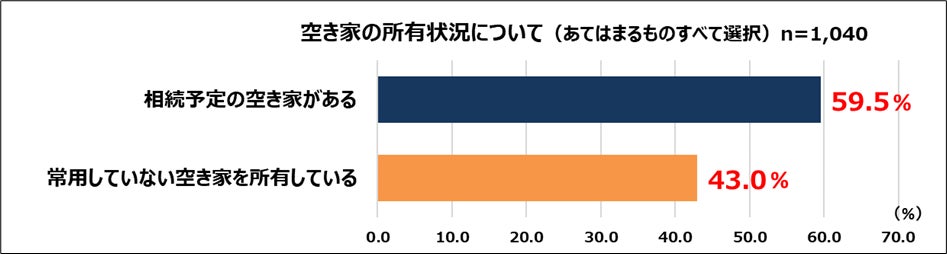 空き家を現在所有している、あるいは今後、相続予定の方、計1,040名を対象にジェクトワンが実施した調査では、空き家の現在の所有状況について、「常用していない空き家を所有している」が43.0%、「相続予定の空き家がある」が59.5%となりました(重複回答有)。年代別で見ると、30~40代では、30代の約8割、40代では3人に2人が「相続予定の空き家がある」と回答し相続予定の方が多い傾向となり、50代~60代は全体的な母数が増え、それぞれの年代で所有と相続予定における差が小さくなる傾向がみられました。
