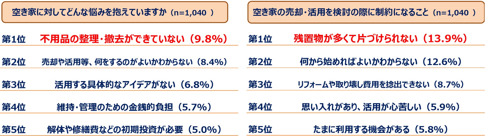 空き家に対する一番の悩みを尋ねたところ、「不用品の整理・撤去ができていない」(9.8%)が最も多く、続いて「売却や活用等、何をするのがよいかわからない」(8.4%)、「活用する具体的なアイデアがない」(6.8%)という結果になりました。また、空き家の売却や活用を検討する際に制約となることについては、 「残置物が多くて片づけられない」(13.9%)が最も多く、続いて「何から始めればよいかわからない」(12.6%)、「リフォームや取り壊しの費用を捻出できない」(8.7%)という結果になりました。空き家に対する悩み、そして売却・活用の際の制約については、いずれも不用品の処理の問題や、そもそも何をしたらよいかわからないといった課題を抱える空き家所有者が多いことがわかりました。
