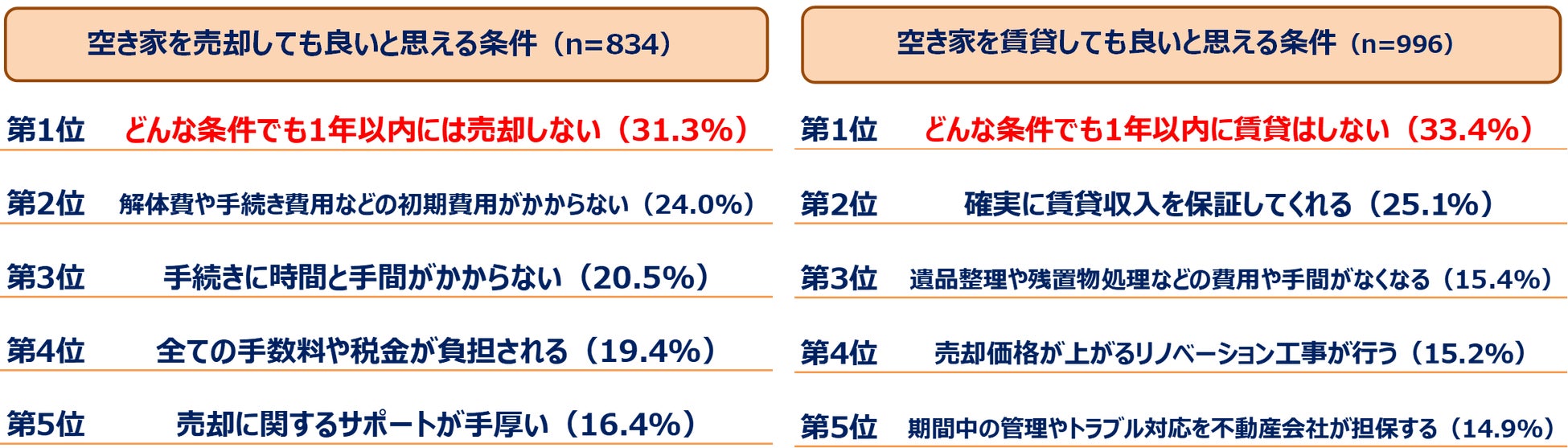 所有する、あるいは今後、相続予定の空き家について、1年以内に売却の予定がないと回答した方を対象に、空き家を売却しても良いと思えるための条件を尋ねると、「どんな条件でも1年以内に売却しない」(31.3%)、続いて「解体費や手続き費用などの初期費用がかからない」(24.0%)、「手続きに時間と手間がかからない」(20.5%)という結果になりました。