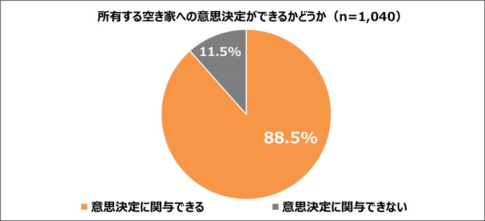 また、空き家の対処について意思決定に関与できるかを尋ねたところ、「関与できる」(「所有権を持っており、意思決定に関与できる」+「所有権を持っていないが、意思決定に関与できる」)は88.5%と、9割近い結果となりました。所有権の有無に関わらず、空き家をどうするか、その対処方法について意思決定に関与できる方が多い一方で、空き家の有効活用に至っていない実態がうかがえます